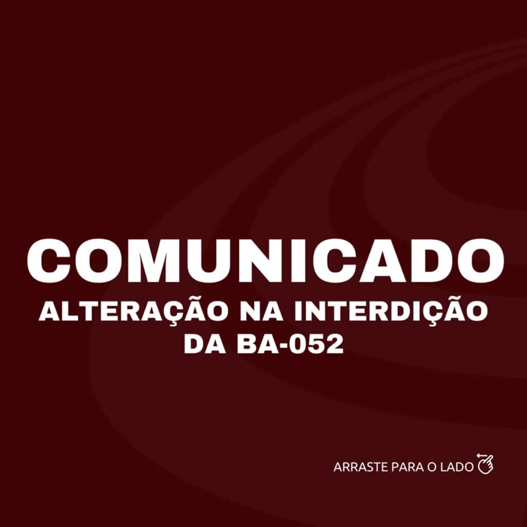 A interdição que aconteceria na BA-052, na região de Morro do Chapéu, neste sábado (02), foi suspensa temporariamente e nova data será definida posteriormente.
