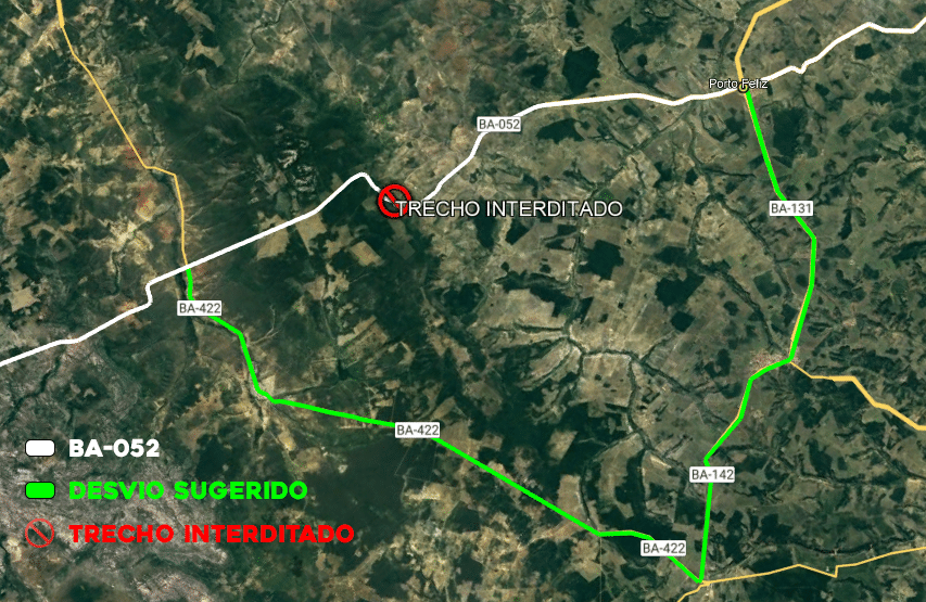 Com isso, torna-se necessário a não utilização da via entre os horários de interdição. Os usuários que necessitarem imprescindivelmente transitar pelo local podem fazer um desvio pegando a BA-131, em Porto Feliz (logo após o km 211 da BA-052), depois a BA-142, em Tapiramutá, em seguida pegar a BA-422, em Volta Grande, voltando a BA-052 no km 242. O caminho para o desvio tem cerca de 50 km.