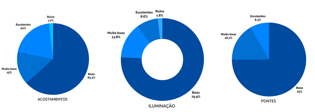 Os acostamentos também receberam altas avaliações, com 63,3% considerados bons, 15% muito bons e 20% excelentes. Quanto à iluminação, a maioria dos entrevistados (73,3%) acredita que está boa, enquanto 13,3% a consideram muito boa e 8,3% excelente. Em relação às pontes, todos os entrevistados afirmam que estão entre boas (75%), muito boas (16,7%) e excelentes (8,3%).