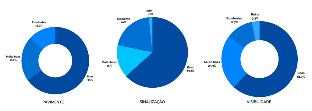 Os resultados revelam que 100% dos entrevistados estão satisfeitos com as condições do pavimento, com 65% classificando-as como boas, 21,7% como muito boas e 13,3% como excelentes. Em relação à sinalização, cerca de 98% dos entrevistados a consideram entre boa (63,3%), muito boa (15%) ou excelente (20%). Quanto à visibilidade, 61,7% a classificam como boa, 23,3% como muito boa e 11,7% como excelente.
