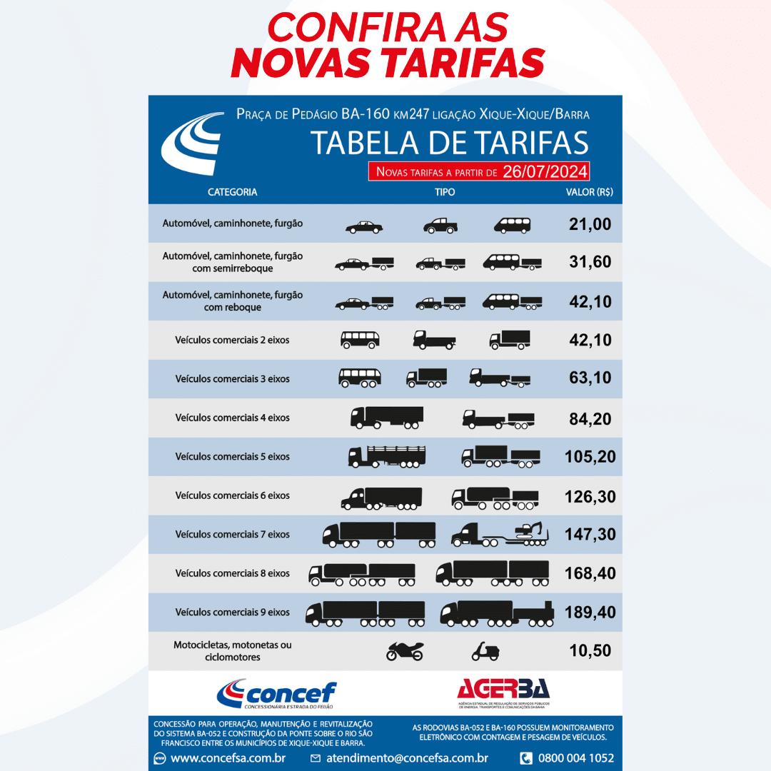 A Concessionária Estrada do Feijão, responsável pelo Sistema Rodoviário da BA-052, anuncia que, a partir de 26/07/2024 haverá um reajuste nos valores das tarifas da Praça de Pedágio da BA-160. A medida foi aprovada pela Agência Estadual de Regulação de Serviços Públicos de Energia, Transportes e Comunicações da Bahia (AGERBA) e publicada no Diário Oficial do Estado da Bahia (19 DE JULHO DE 2024 – ANO CVIII – No 23.954)