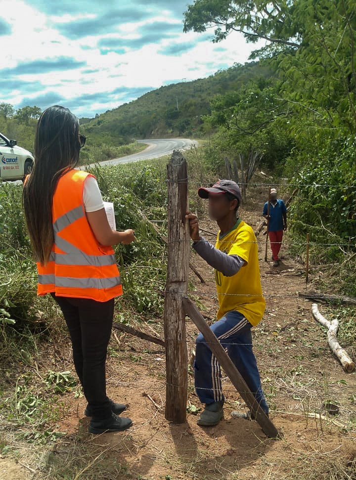 Constantemente as equipes da CONCEF percorrem as rodovias BA-052 e BA-160 com o intuito de preservar a faixa de domínio de construções irregulares que possam comprometer a segurança dos usuários que por aqui trafegam. Nossa assistente social aborda diversos moradores lindeiros para conscientizar o pastoreio de animais e também dialoga com fazendeiros, informando a maneira correta do uso da faixa de domínio.